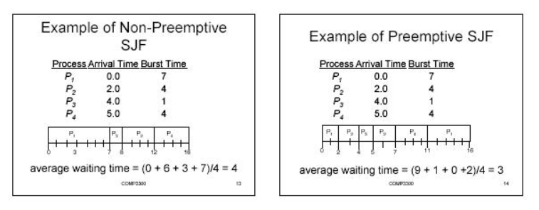그림을 보면 Preemptive한 방식의 SJF의 평균 Waiting time이 적긴한데, 만약 작업이 매우 많아지는 상황을 생각해보면 매 시간마다 남은 시간이 적은 녀석으로 계속 교체를 할 것이고 그렇게 되면 프로세스 스위칭에 드는 오버헤드가 커질 수도 있습니다. Waiting time에는 이런 문제점이 고려되지 않았다는 점을 인식하고 있어야겠죠?