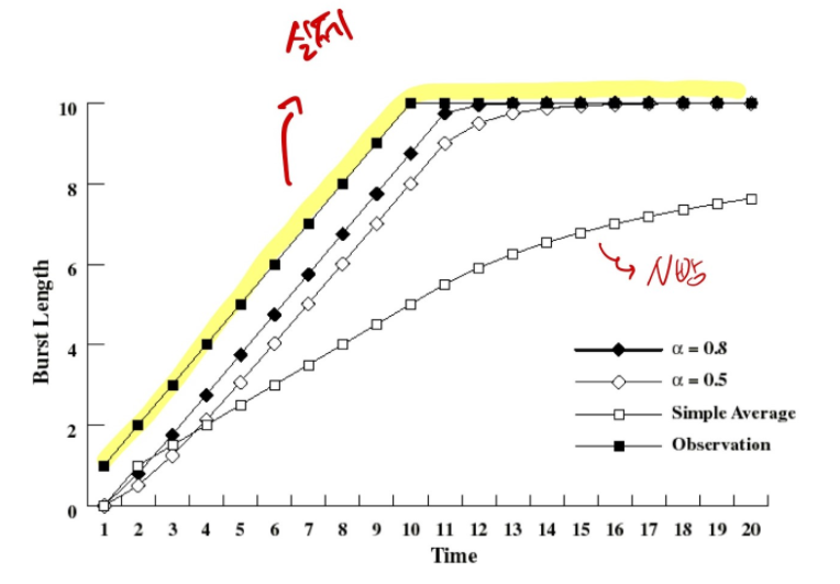 - Exponential Average : 최근에 거쳤던 작업시간이 현재 작업 시간을 결정하는데 큰 영향을 미치리라는 가능성으로 가까운 시간에 대해 더 큰 Weight를 주는 방식으로 평균값을 구한다.