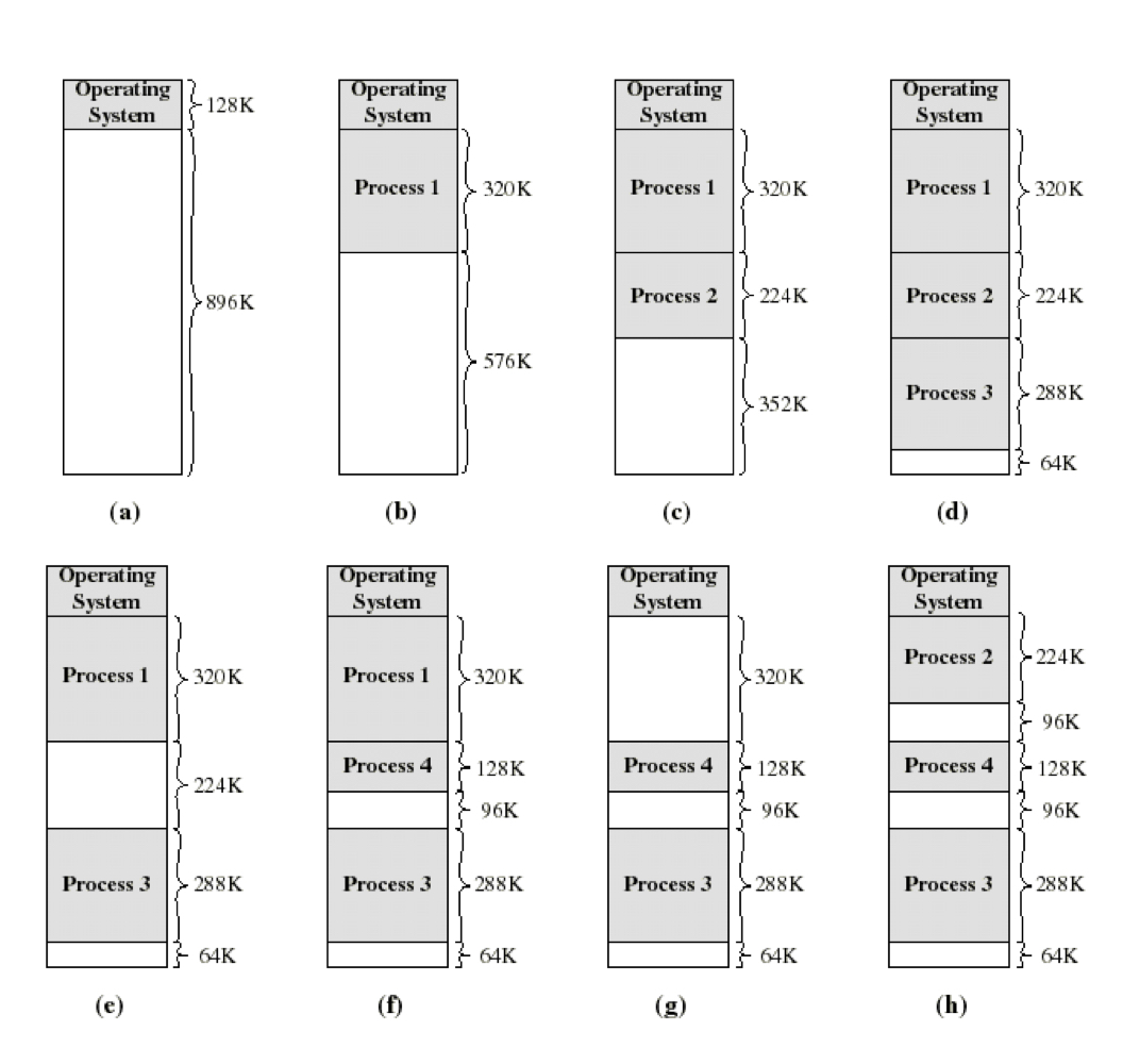 Dynamic partitioning에서 실제 메모리가 어떤 식으로 할당되는지 아래 그림을 통해 보겠습니다.
