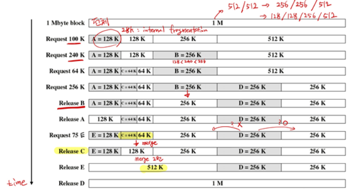 맨 처음에는 1M만큼의 전체 메모리가 존재하고, 100K의 프로세스가 요청될 때 메모리를 쪼개가면서 128K의 공간을 할당합니다. 이런 과정을 반복하다가 어떤 Process가 Release되면 자신의 Buddy(같은 부모로부터 Split된 녀석)을 찾고, Buddy가 비어있다면 Merge합니다.