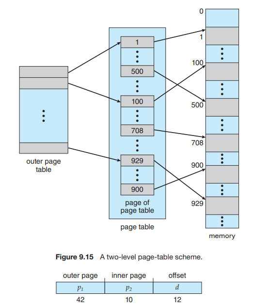 구체적으로 들여다보면, 20 bit 중에서 p1이 나타내는 10bit는 Outer page의 인덱스를 나타내고, p2은 Inner page의 인덱스를 나타냅니다. 다시 말해서, p1은 이제 하나의 프로세스가 가지는 페이지 테이블 전체를 지칭하게 되고, p2는 그 안에서 개별적으로 존재하는 페이지들을 가리키는 것이죠.