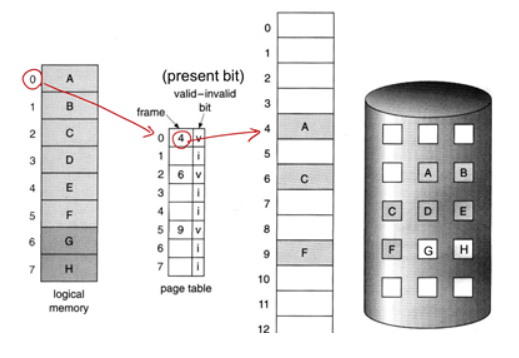 그림을 보면 맨 왼쪽의 프로세스가 가지는 여러 개의 페이지 중에서 실제로 물리적 메모리에 올라가 있는 것은 A, C, F밖에 없습니다.