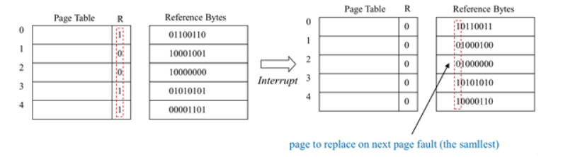 이 때, 각 페이지의 현재 Reference bit을 Reference bytes라는 별도의 메모리에 기록해놓고 LSB(Least Significant Bit)의 값을 갱신해주는 방식입니다. 그리고 만약 페이지 폴트가 발생하면 각 페이지의 Reference bytes를 체크해서 그 값이 가장 작은 녀석을 아웃시킵니다.