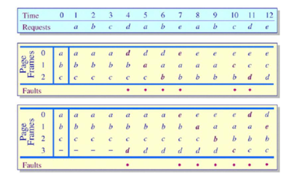 위 그림을 보면 프로세스에 프레임을 3개 할당했을 때와 4개 할당했을 때 페이지 폴트의 수가 줄어들지 않는 것을 볼 수 있습니다.