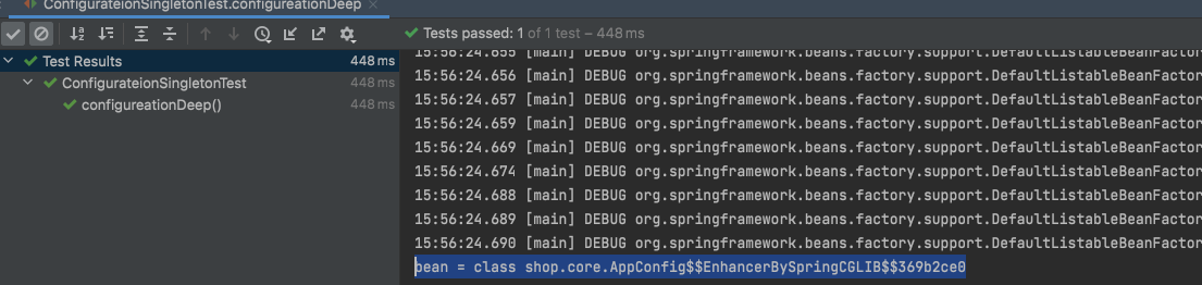 그리고 이렇게 등록된 AppConfig@CGLIB가 싱글톤 패턴을 보장하도록 도와주는데, 그 안에서 스프링 컨테이너에 등록된 객체를 호출하면 기존의 빈을 리턴해주는 로직을 담고 있는 것입니다.