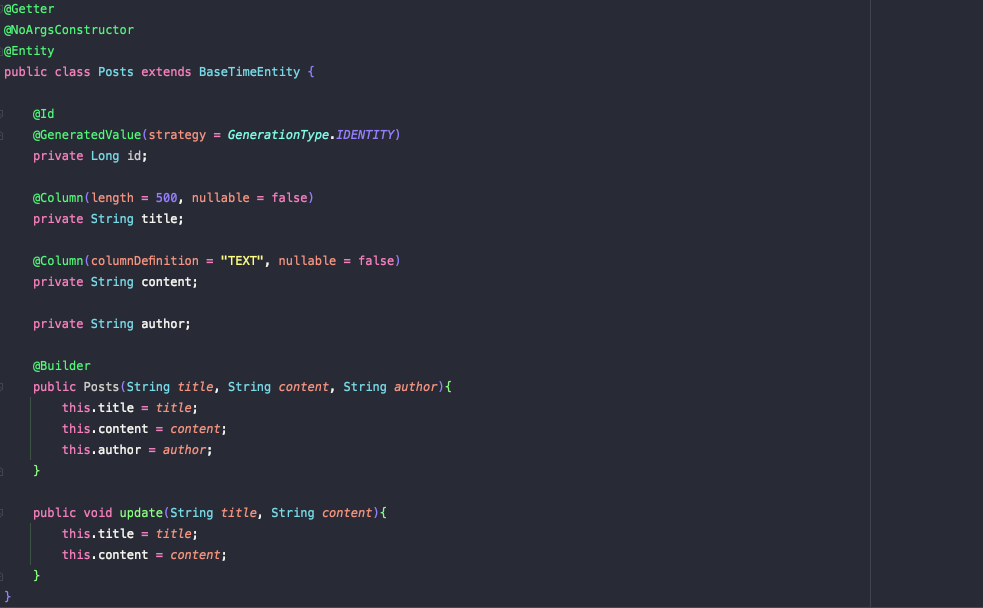 위 예제 코드는 Posts라는 엔티티를 생성하는 코드입니다.