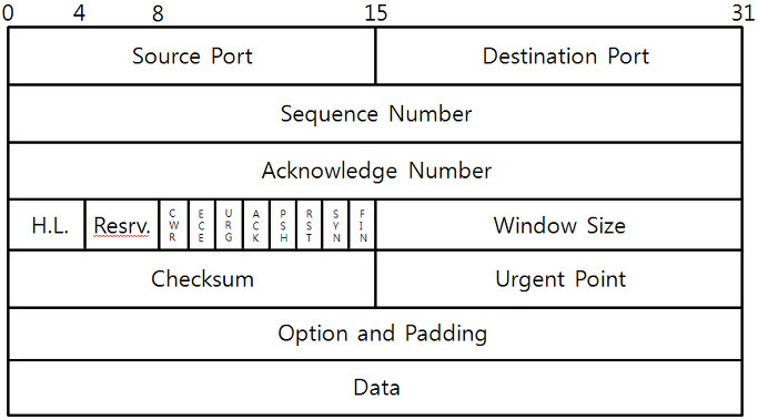 지금까지 간단하게 설명한 내용이 바로 세 방향 핸드셰이크(3-Way Handshake)에 대한 개념입니다. 그렇다면 이제 구체적인 세 방향 핸드셰이크의 동작 원리에 대해 알아볼텐데요. 그 전에 우선 핸드셰이크라는 개념 자체는 TCP 프로토콜에서 이루어지는 것이다보니, 그 원리를 알기 위해서는 TCP 세그먼트의 구조를 한 번 살펴봐야할 것 같습니다.