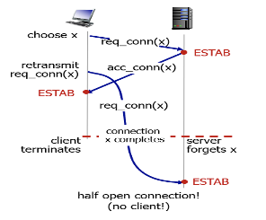 위 그림을 예로 들어 보겠습니다. 위 그림은 호스트 A가 호스트 B에게 연결 요청을 한 것이 딜레이가 많이 되어 다시 연결 요청을 하는 상황입니다. 이 경우 호스트 B는 과거의 연결 요청에 대한 순서 번호로 응답을 하게 되고, 호스트 A는 잘못된 순서 번호의 패킷이 왔기 때문에 그 패킷을 버리게 되죠.