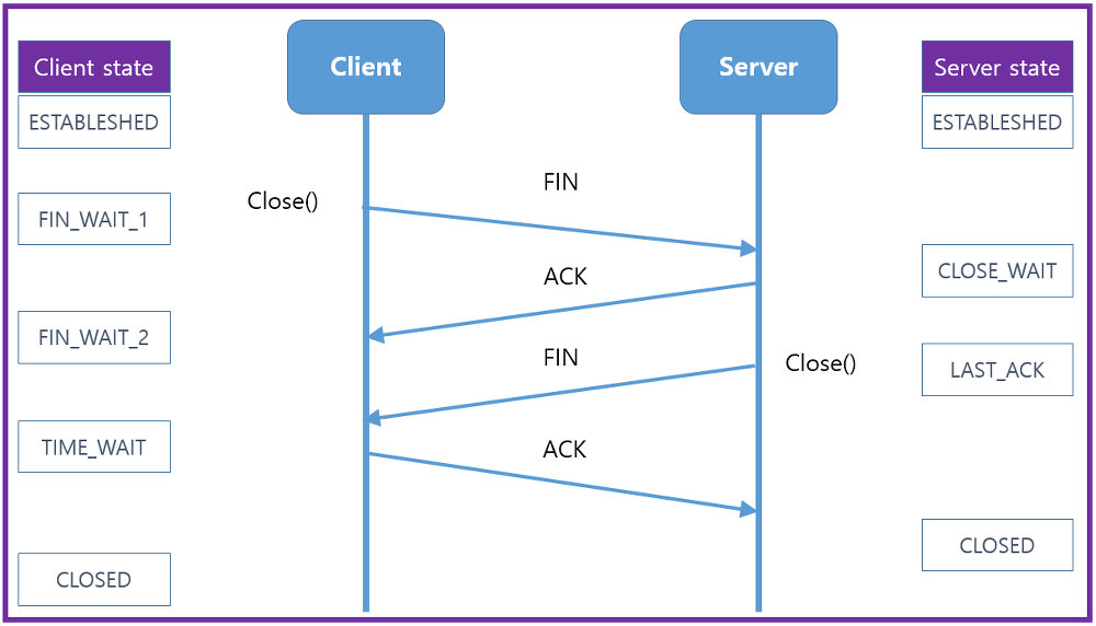 클라이언트와 서버가 연결을 종료할 때도 핸드쉐이크 과정이 필요합니다. 한 쪽이 일방적으로 연결을 끊어버리면 신뢰적인 데이터 전송이 안되겠죠?