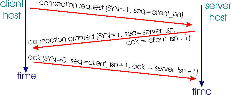 먼저 클라이언트 측 TCP는 서버 TCP에게 특별한 TCP 세그먼트를 송신합니다. 이 특별한 세그먼트는 애플리케이션 계층 데이터를 포함하지 않고, 세그먼트의 헤더에 SYN 비트라고 불리는 하나의 플래그 비트를 가집니다.