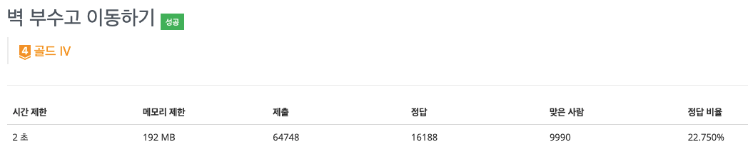 하지만, 임의의 벽을 하나 제거하고 BFS를 수행하는 행위를 반복하면 시간초과가 발생하기 때문에 한 번의 BFS를 진행하는동안 "벽을 부순 상태인지, 부수지 않은 상태인지'를 큐에 담고 다녀야 합니다.