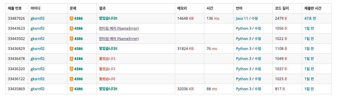 | [백준(Python/Java)] 2206_벽 부수고 이동하기(BFS) (0) | 2021.09.14 |