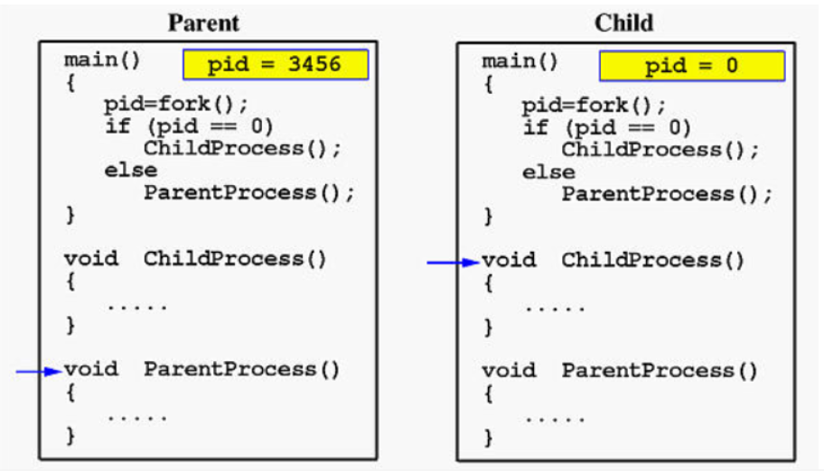 또한, fork() 명령어 수행 시 Parent는 Child의 pid값을 리턴하고, child는 0을 리턴합니다. 그래서 이 리턴값을 기준으로 Parent, Child 프로세스를 구분하고, 각 프로세스가 다른 동작을 수행할 수 있게 할 수 있죠.