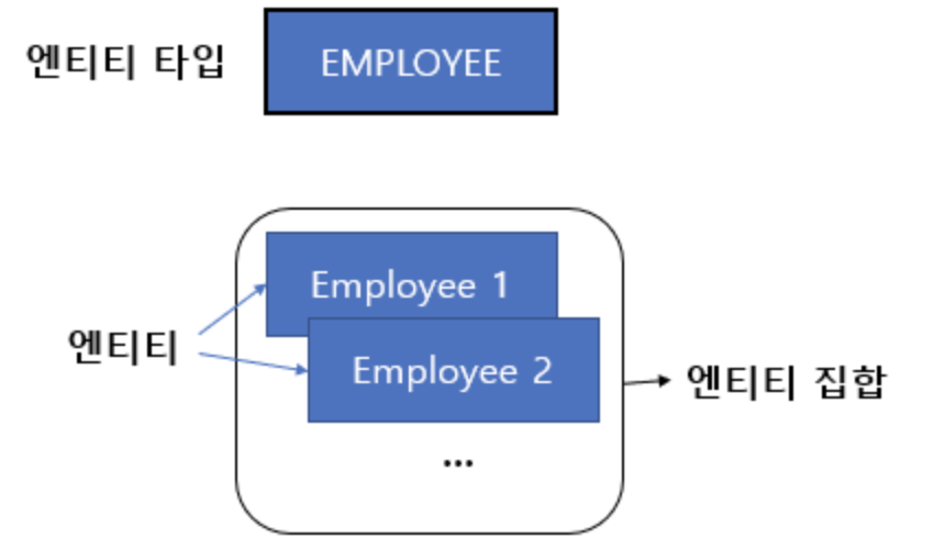 그런데 Entity와 관련해서 조금 헷갈리지만 반드시 구분해서 사용해야 할 개념들이 있는데요. 바로 Entity Type, Entity Set, 그리고 Entity입니다. 그림을 통해 차이점을 들여다보겠습니다.