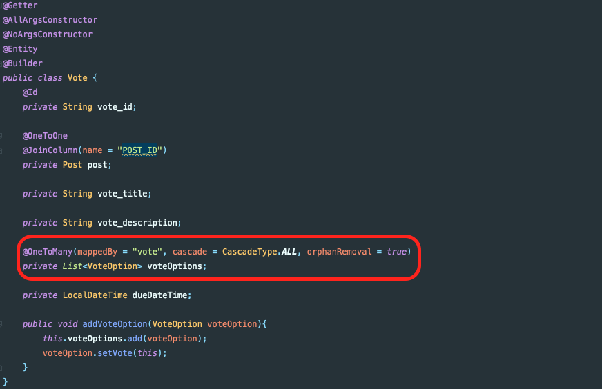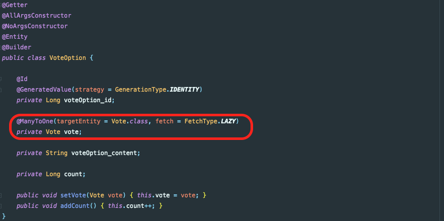 그리고 VoteOption은 한 개의 Vote에 여러 개가 존재하므로 @ManyToOne 어노테이션으로 Vote를 참조합니다.