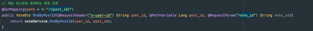 Request-Header로 조회한 유저의 아이디를 받고, 게시물의 아이디와 투표의 아이디를 PathVariable로 받는 RestController입니다.