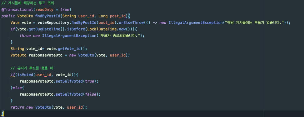 이 때 Service는 해당 정보를 받아서 게시물에 투표가 존재하는지 확인하고, 종료된 투표인지 확인합니다. 그리고 요구사항에 따라 투표를 조회한 유저가 해당 투표에 투표를 했는지 Setter를 통해 설정해주고, VoteDto객체를 리턴합니다.