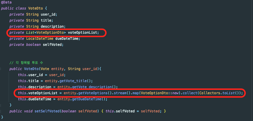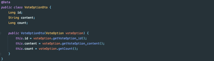 VoteOption이라는 엔티티 자체를 리스트로 받지 않고, VoteOptionDto라는 DTO를 만들어주는 방식인데요. Service에서 받아온 Vote가 가지고 있던 VoteOptions를 entity.getVoteOptions()를 통해 가져오고, 아래와 같은 VoteOptionDto로 만들어줍니다.