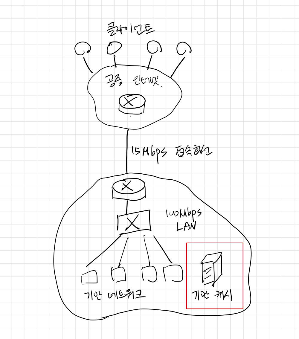 기관 네트워크는 100Mbps 속도의 LAN이고 기관 네트워크에 있는 라우터와 인터넷에 있는 라우터는 15Mbps 회선에 연결되어 있으며, 요청되는 데이터의 크기를 평균 1Mbit, 클라이언트는 평균적으로 서버에 초당 15번의 요청을 보낸다고 하겠습니다. 또한 접속 회선의 인터넷 부분 라우터가 HTTP요청을 전달하고 응답을 받을 때 까지 평균 2초의 시간이 걸린다고 가정하겠습니다.