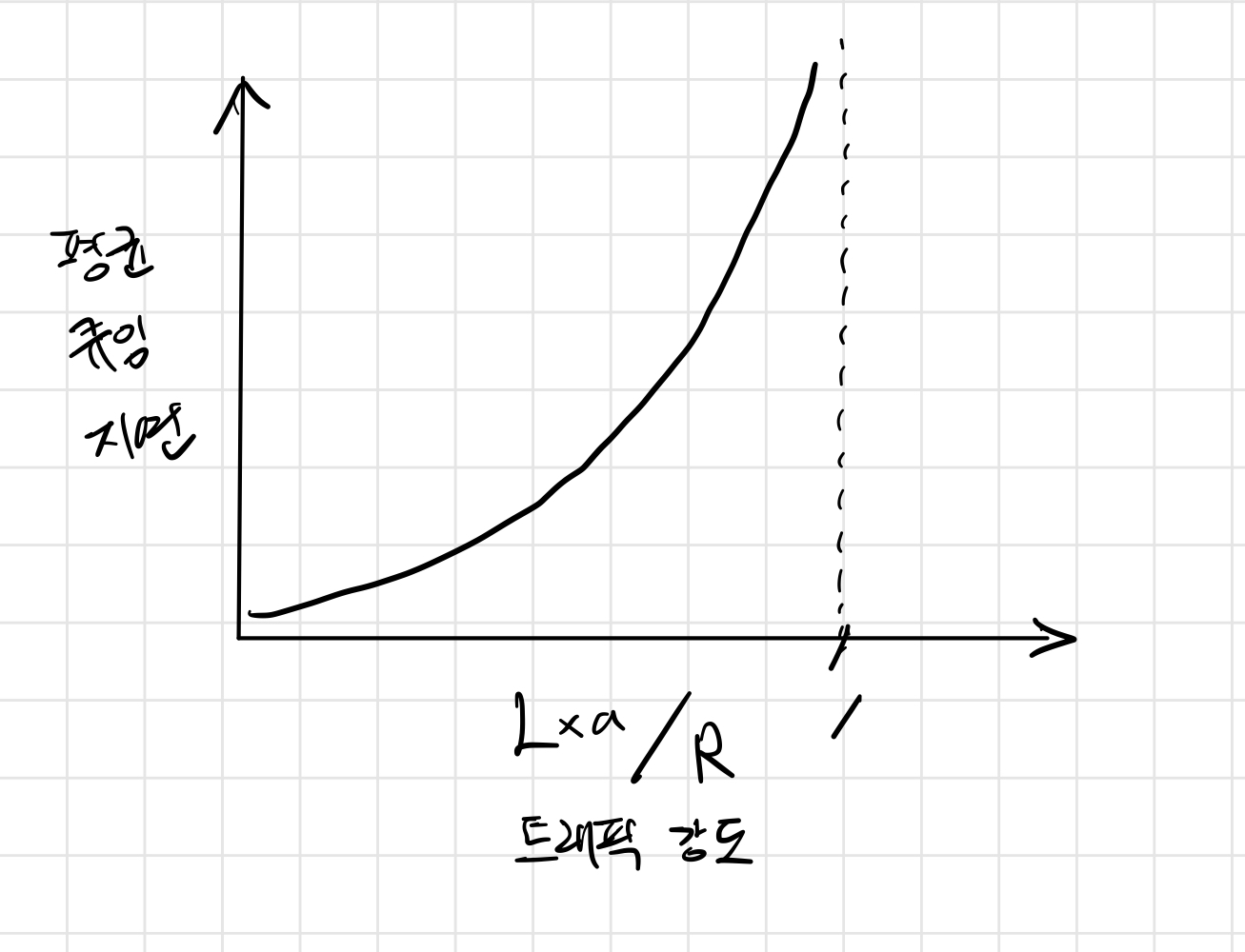 위와 같은 상황에서 트래픽 강도 = L*a / R로 정의합니다. 이 때, 아래 그래프처럼 트래픽 강도가 1에 접근할수록 평균 큐잉 지연이 급속히 증가합니다.