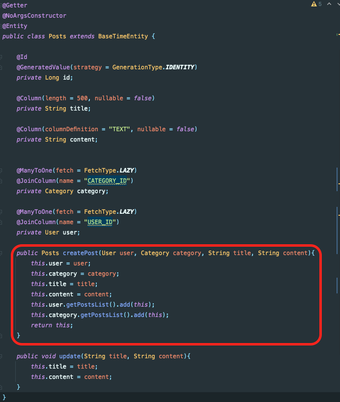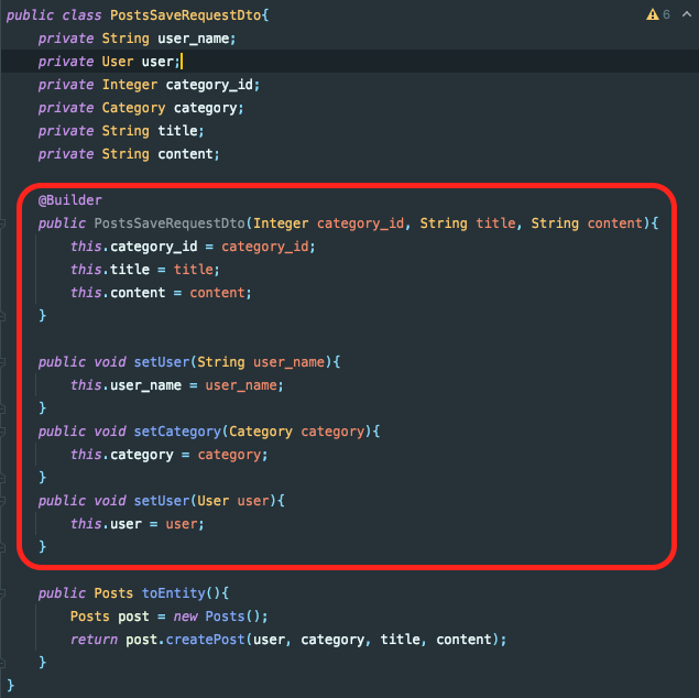 이 글을 지금 다시 읽어보니, DTO 설계가 완벽히 잘못됐다고 생각이 듭니다. 애초에 Post DTO에는 카테고리 자체가 들어갈 필요가 없는 것 같습니다. 카테고리 아이디만을 받아서 포스트 엔티티를 생성하고, 서비스 로직에서 포스트 엔티티의 카테고리를 넣어주면 될 것 같습니다. 나중에 다른 글로 정리해봐야겠습니다.