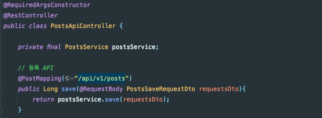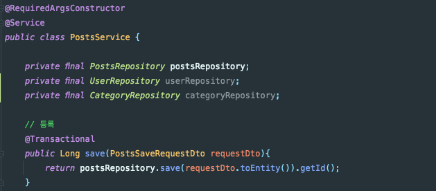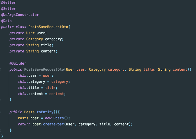 아래는 게시물 작성과 관련된 Controller, Service, Post 엔티티, PostSaveDTO입니다. PostSaveDTO는 게시물을 작성할 때 JSON 데이터를 객체로 입력받아 서비스 로직에 던져지는 녀석입니다.
