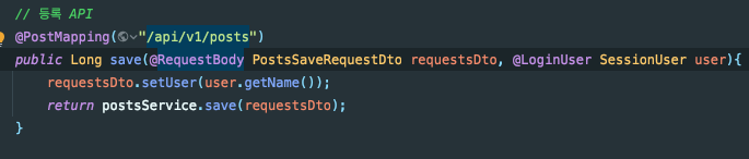 Controller에서는 현재 세션 유저의 이름을 requestDto의 userName으로 지정해줍니다.