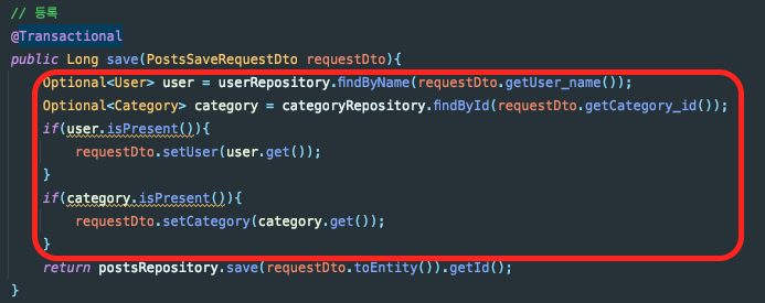 이 때, 유저의 정보는 컨트롤러에서 로그인 유저의 세션 정보를 이용해 그대로 입력받으면 된다고 생각했고, 카테고리의 매핑에 대해서는 카테고리 아이디를 전달받은 후에 카테고리 레포지토리를 조회해서 해당 카테고리를 Post에 매핑을 해주는 로직이 필요하다고 생각했습니다.
