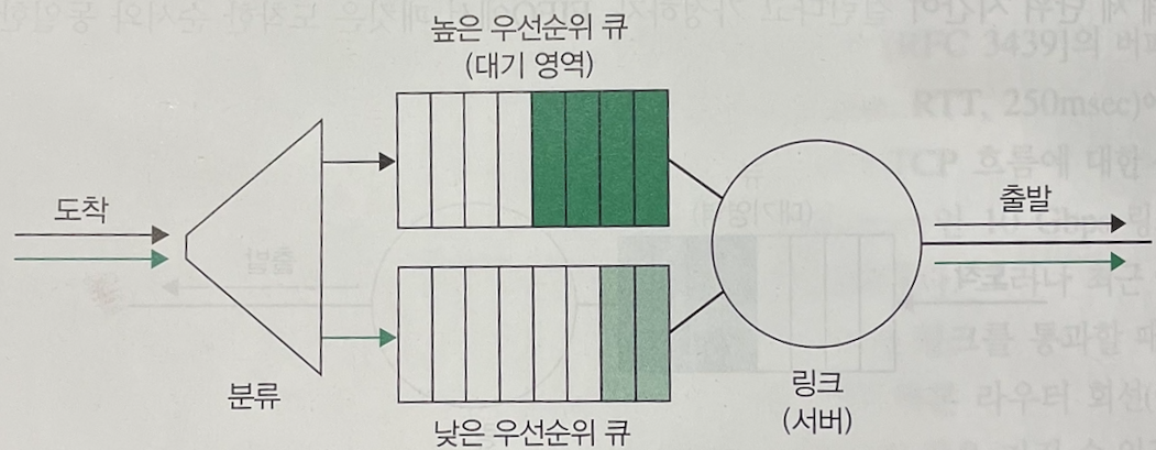 그림에서 클래스1에 속하는 1번 패킷을 보낸 다음에, 클래스 2번에 속하는 3번 패킷을 보내고 그 다음에 다시 클래스 1에 속하는 2번 패킷을 보내는 것을 확인할 수 있습니다.