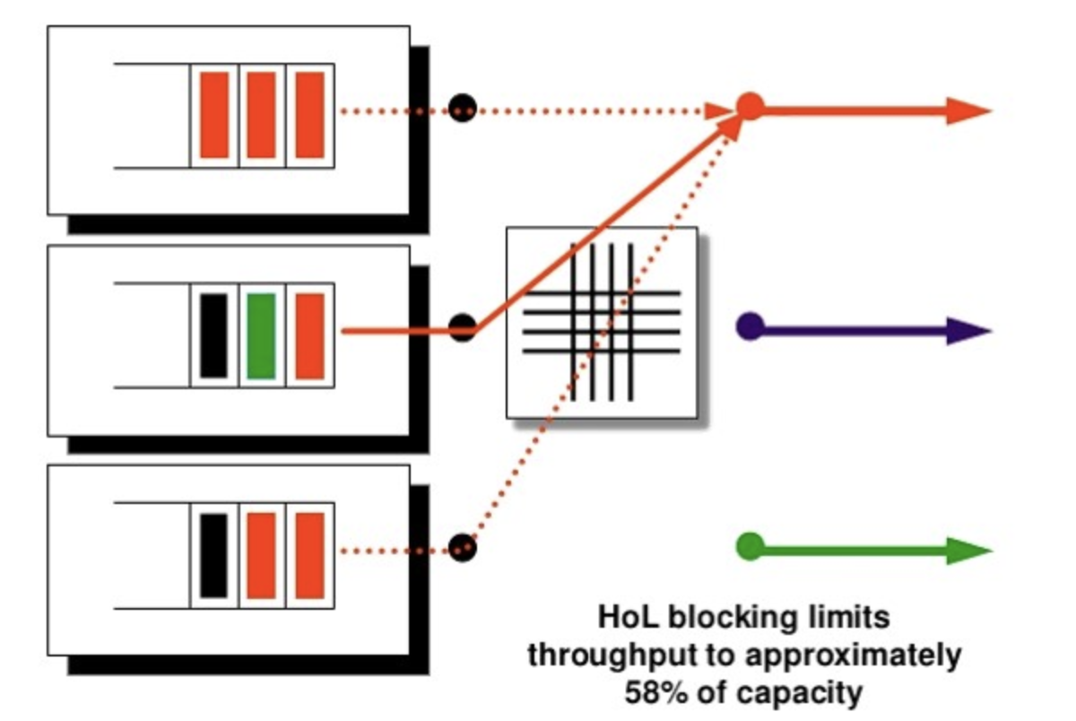 그리고 이 현상을 HOL(Head-Of-the-Line) 차단 현상이라고 하는데요. 회선의 앞쪽에서 다른 패킷이 막고 있으므로 입력 큐에서 대기 중인 패킷은 사용할 출력 포트가 사용 중이지 않아도 스위칭 구조를 통해 전송되기 위해서 기다려야 한다는 것이죠.