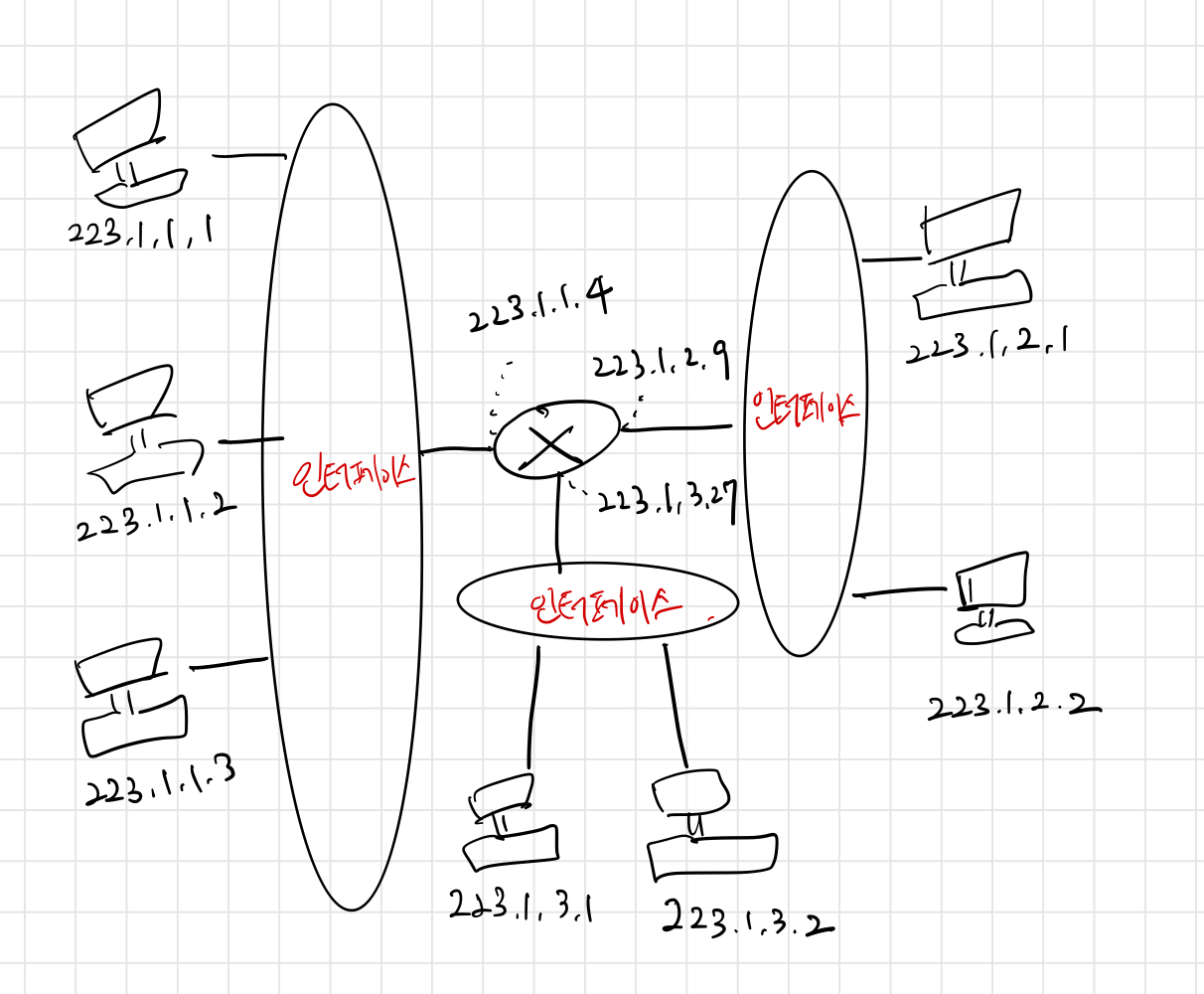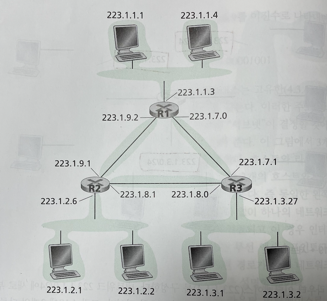 다시 돌아와서, 서브넷 223.1.1.0/24는 세 호스트 인터페이스(223.1.1.1, 223.1.1.2, 223.1.1.3)와 하나의 라우터 인터페이스(223.1.1.4)를 구성합니다. 만약 네트워크 223.1.1.0/24에 새로운 호스트가 배정된다면, 그 호스트는 223.1.1.xxx형식의 주소가 필요하겠죠?