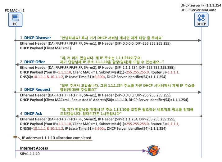 DHCP를 통한 IP 주소 할당은 “임대”라는 개념을 가지고 있는데 이는 DHCP 서버가 IP 주소를 영구적으로 단말에 할당하는 것이 아니고 임대기간(IP Lease Time)을 명시하여 그 기간 동안만 단말이 IP 주소를 사용하도록 하는 것입니다. 단말은 임대기간 이후에도 계속 해당 IP 주소를 사용하고자 한다면 IP 주소 임대기간 연장(IP Address Renewal)을 DHCP 서버에 요청해야 하고 또한 단말은 임대 받은 IP 주소가 더 이상 필요치 않게 되면 IP 주소 반납 절차(IP Address Release)를 수행하게 됩니다.