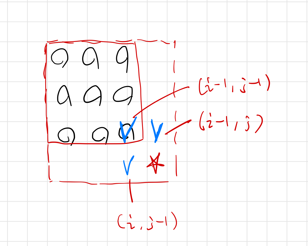 만약 dp[i][j]를 구한다고 해봅시다. 우선 해당 지점의 값이 0이면 애초에 정사각형을 만들 수 없기 때문에 패스하고, 해당 지점의 값이 1이라면 dp[i-1][j], dp[i][j-1], dp[i-1][j-1] 지점의 값을 살펴봐야 합니다. 왜 그럴까요?