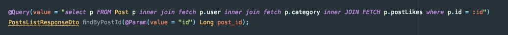 위 내용은 게시물(Post)을 조회할 때 게시물을 작성한 유저의 정보와 해당 게시물에 관련된 '좋아요' 정보를 함께 불러오는 JPQL 쿼리입니다.