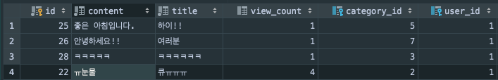 위 게시물 테이블을 보면 4개의 게시물을 작성한 user_id가 모두 1입니다. 그리고 게시물은 외래키로 user_id를 가지고 있죠? 따라서 위 게시물들을 조회할 때 user_id를 가지고 Join을 하게 되면 해당 게시물의 제목, 내용과 여러 데이터를 포함해서 1번 유저의 이름 등을 같이 가져오게 되고, 이를 뷰에서 표기할 수 있게 되는 것입니다.