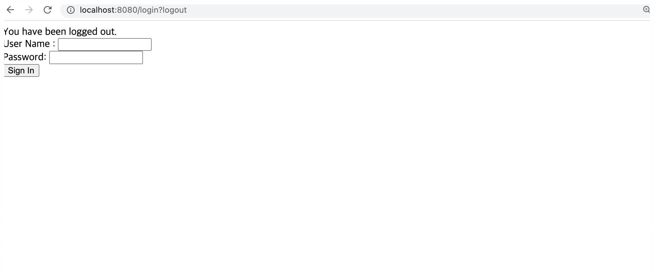 마지막으로 로그아웃을 하게 되면 아래와 같이 로그아웃을 했음을 알리는 문구('You have been logged out')이 나타나고, 다시 로그인을 하는 화면으로 리다이렉트 됩니다.