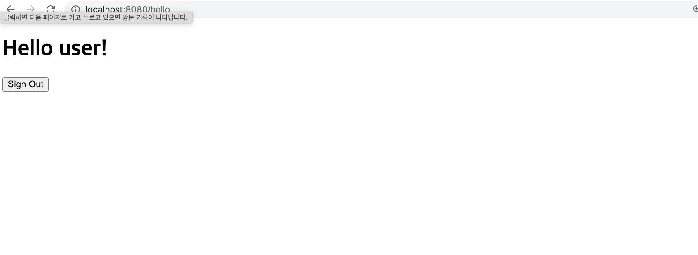 그리고 위에서 등록해뒀던 (user, password)로 로그인을 시도하면 아래와 같이 정상적으로 "/hello"에 접근이 되고 유저의 이름(user)와 로그아웃 버튼이 나타는 것을 확인할 수 있습니다.