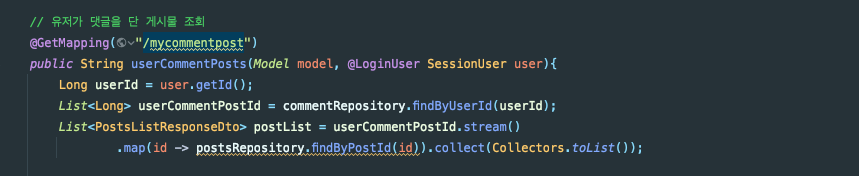 먼저 유저의 아이디를 가지고 유저가 남긴 Comment들을 distinct하게 추출해서 userCommentPostId 리스트에 담았습니다.