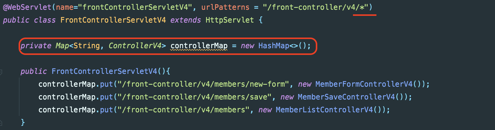 @WebServlet(name="frontControllerServletV4", urlPatterns = "/front-controller/v4/*")