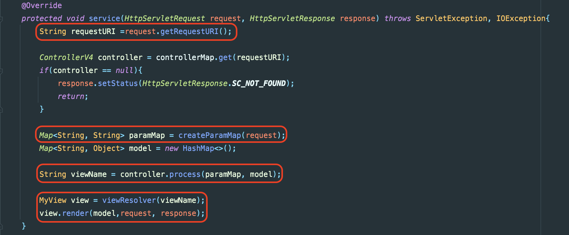 프론트 컨트롤러의 service() 메서드는 아래와 같은 역할을 수행하는데요. 하나씩 살펴보겠습니다.
