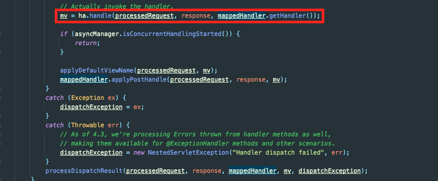 우선 가장 기본적으로 servlet이 호출되면 아래와 같이 doServlce() 메서드가 호출됩니다. doService()의 코드를 쭉 읽다보면 아래에서 doDispatch() 메서드가 호출되는데요. 메서드 이름에서 알 수 있다시피, 실제로 dispatch를 실행하는 과정이 진행됩니다.