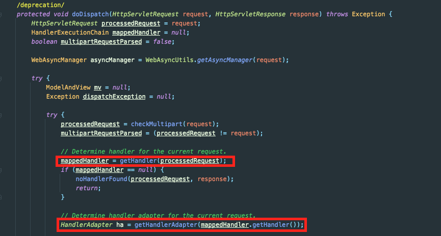 가장 먼저 doDispatch()에서는 클라이언트의 요청에 해당하는 핸들러를 조회하고, 해당 핸들러를 받기 위한 어댑터를 조회합니다.