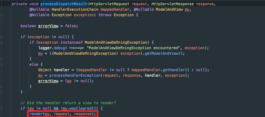 render() 메서드 안에서는 뷰 리졸버(viewResolver)를 통해 뷰를 찾고, 해당 view를 반환받습니다. 그리고 마지막으로 뷰를 실제로 렌더링하죠.