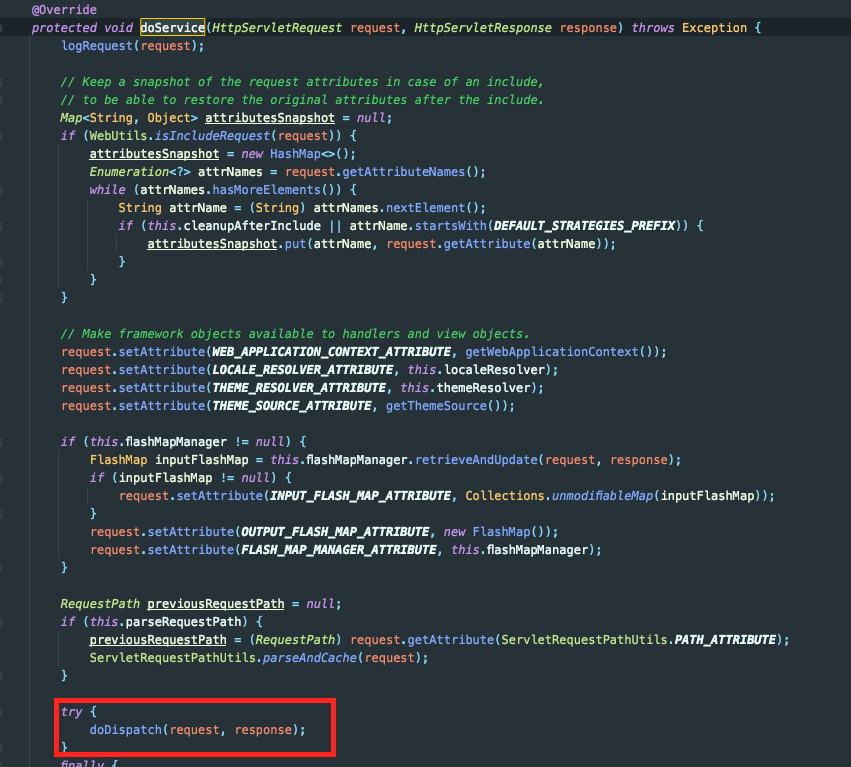 우선 가장 기본적으로 servlet이 호출되면 아래와 같이 doServlce() 메서드가 호출됩니다. doService()의 코드를 쭉 읽다보면 아래에서 doDispatch() 메서드가 호출되는데요. 메서드 이름에서 알 수 있다시피, 실제로 dispatch를 실행하는 과정이 진행됩니다.