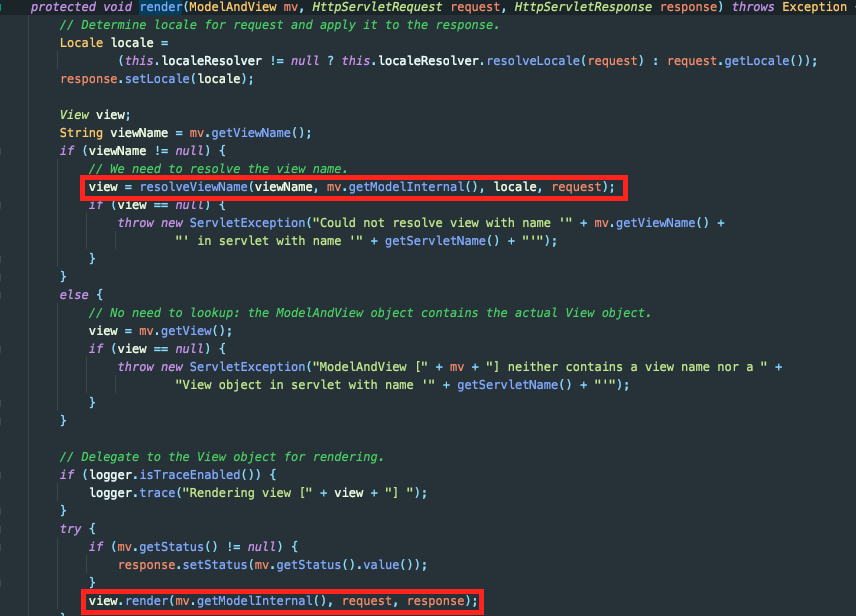 render() 메서드 안에서는 뷰 리졸버(viewResolver)를 통해 뷰를 찾고, 해당 view를 반환받습니다. 그리고 마지막으로 뷰를 실제로 렌더링하죠.