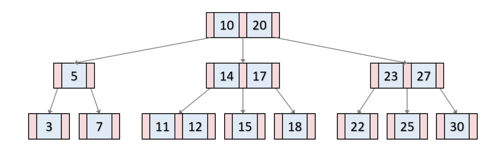 한편, B-Tree에서 하나의 노드가 최대 M개의 자식을 가질 수 있을 때 이를 M차 B-Tree라고 하며 B-Tree에서 각 노드의 자료는 정렬된 상태가 유지되고, 노드의 값을 기준으로 왼쪽은 노드보다 작은 값이 들어가고 오른쪽 서브트리는 더 큰 값이 들어갑니다.