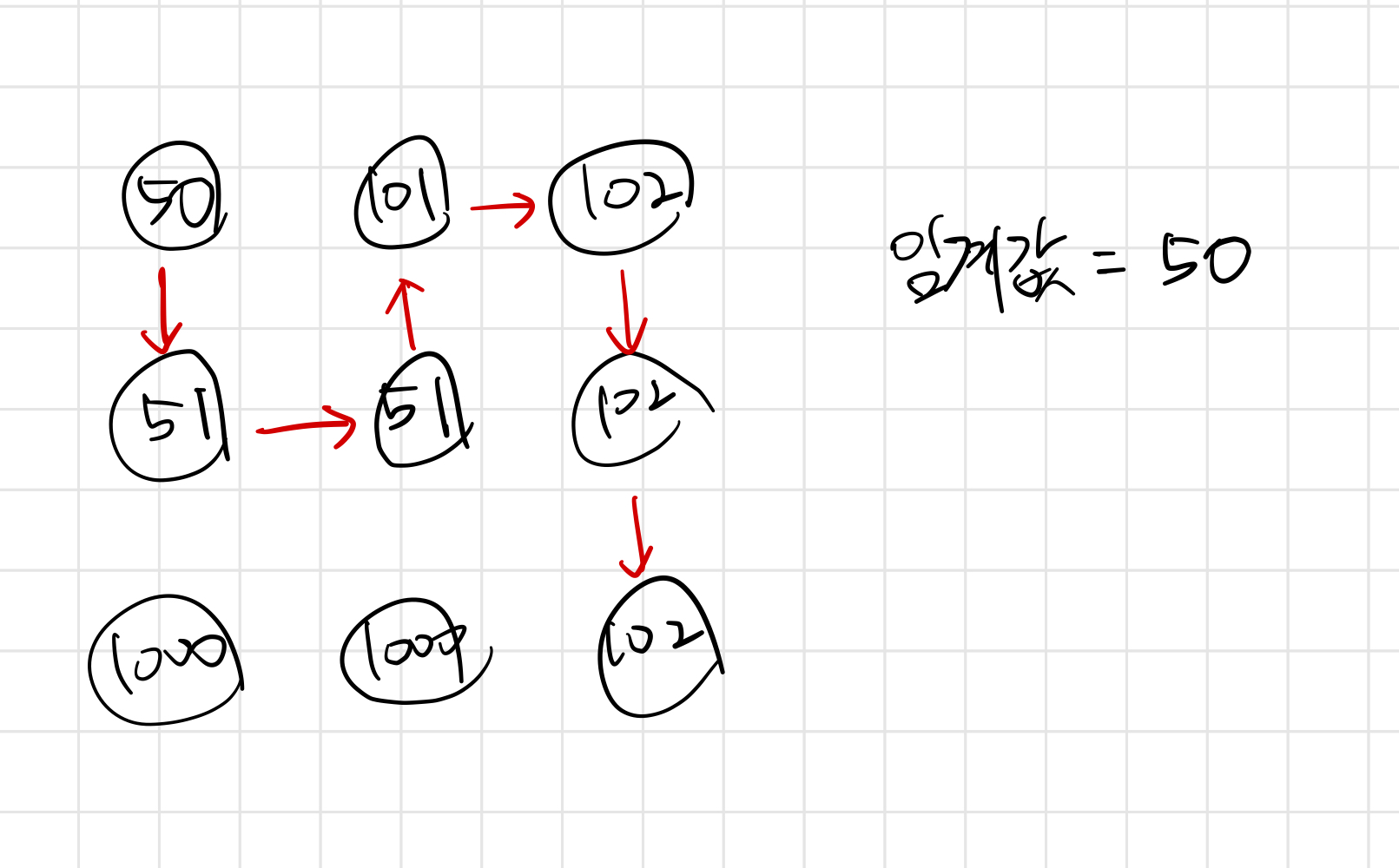위와 같은 예시에서 시작점(1,1)에서 움직일 수 있는 곳은 (2,1)밖에 없으며, (2,1)에서는 (2,2)로만 이동 가능합니다. 그리고 (2,2)에서는 (1,2)로 이동할 수 있는데요. 이전에 (1,1)에서 (2,1)을 방문할 수 없었기 때문에 (2,2)에 와서야 (1,2)로 이동할 수 있게 되는 것입니다. 이런 식으로 이동을 반복하면 최단 경로로 끝점까지 가지는 못하지만, 임계값 50을 넘기지 않고 도착점까지 이동이 가능합니다.