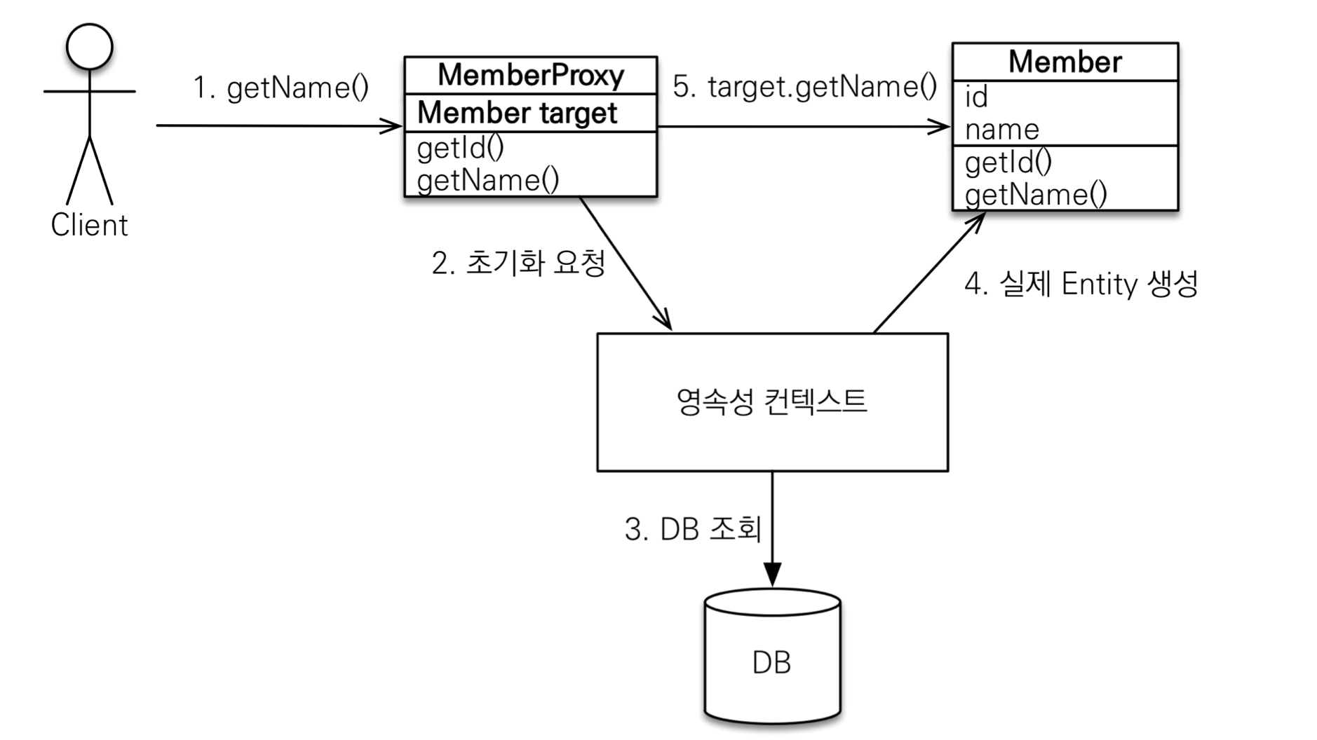 지금 설명하는 예제 상황에서는 Order를 조회하면 최초에 지연 로딩으로 Member, Delivery에 대한 프록시 객체가 만들어집니다. 그런데 이 프록시 객체에는 Member, Delivery의 실제값은 존재하지 않고 참조(target)만 가지고 있으므로, 실제 데이터가 필요할 때는 get() 메서드를 호출하여 DB 조회를 하는 것입니다.
