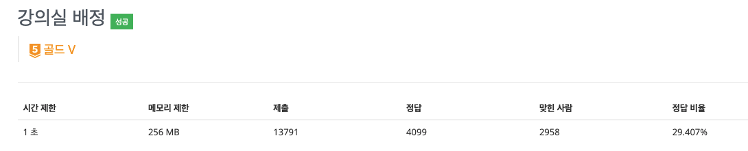 바로 두 번째 강의실입니다. 하지만 위의 코드를 따라가보면, 네 번째 수업의 종료 시간이 가장 먼저 끝나는 강의실로 설정되게 되죠.
