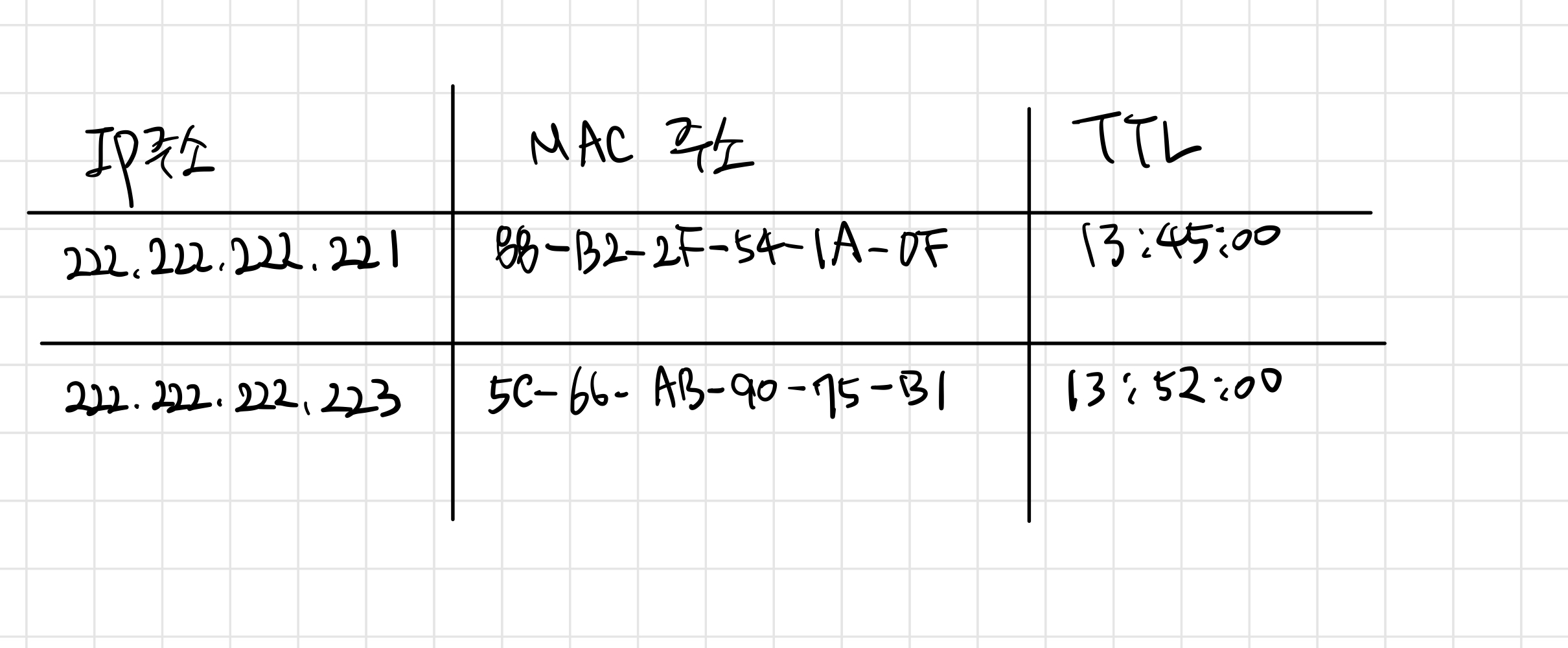 우선 각 호스트와 라우터는 자신의 메모리에 ARP 테이블을 갖고 있습니다. 이 ARP 테이블은 아래와 같이 IP 주소와 MAC 주소 간의 매핑 정보와 TTL(Time-To-Live) 값을 저장하고 있습니다. TTL은 테이블에서 각 매핑이 언제 삭제되는지를 나타냅니다.